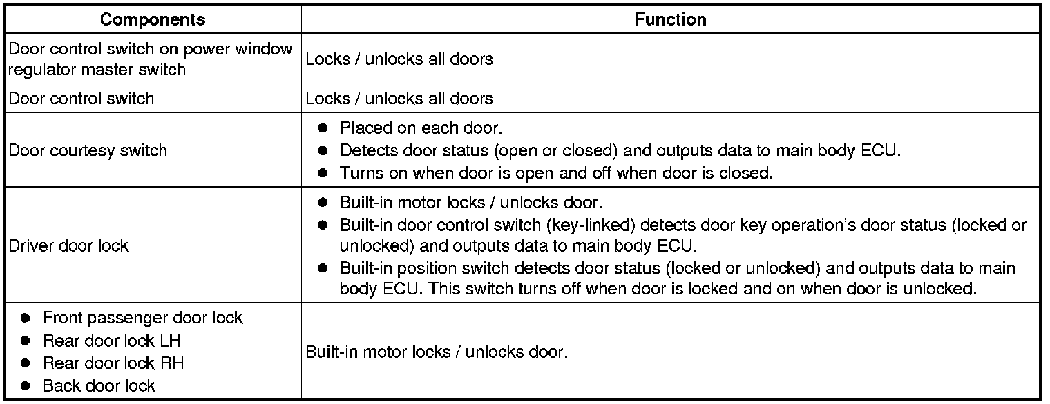 This system is controlled by the main body ECU. The main body ECU outputs signals to each door lock motor. The door lock control system in the vehicle has the following functions: