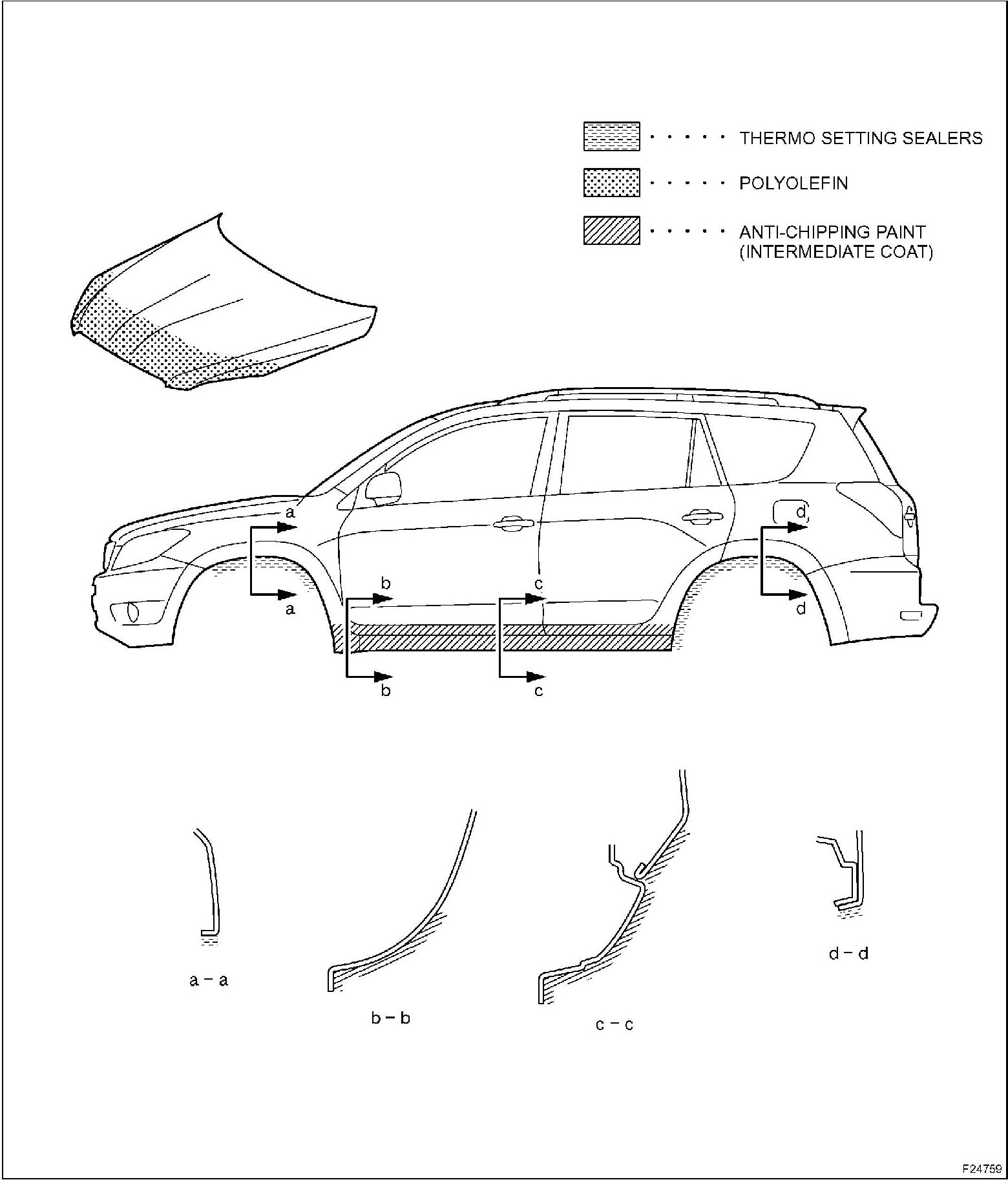 BODY PANEL ANTI-CHIPPING PAINT APPLICATION AREASTo protect the body from damage due to flying rocks, apply the anti-chipping paint to the rocker panels, wheel arches, and lower parts of the doors.