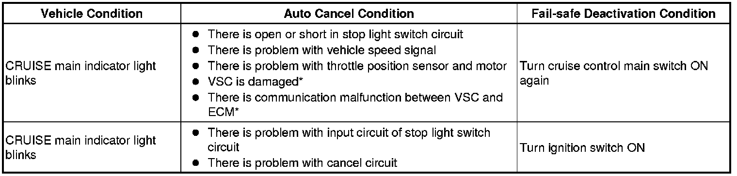 HINT: If the following conditions are detected while the cruise control is in operation, the system clears the stored vehicle speed in the ECM and cancels the cruise control operation.