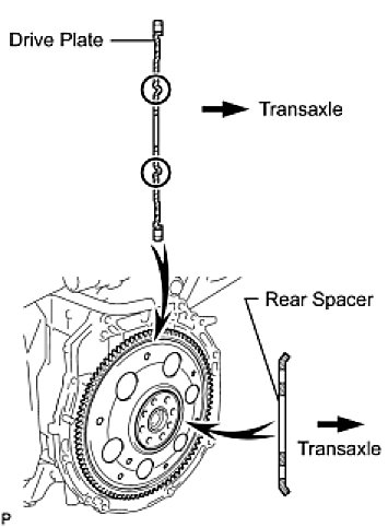 (e) Install the drive plate and rear spacer onto the crankshaft.