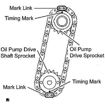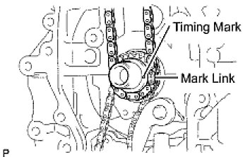 (b) Install the chain onto the crankshaft timing sprocket with the gold or orange mark link aligned with the timing mark on the crankshaft.