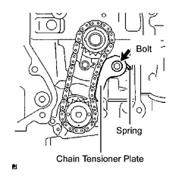 (f) Insert the damper spring into the adjusting hole, and then install the chain tensioner plate with the bolt.