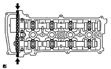 (1) Turn the camshafts with a wrench (using the hexagonal lobe) to align the timing marks of the camshaft timing gear with each timing mark located on the No. 1 and No. 2 bearing caps as shown in the illustration.
