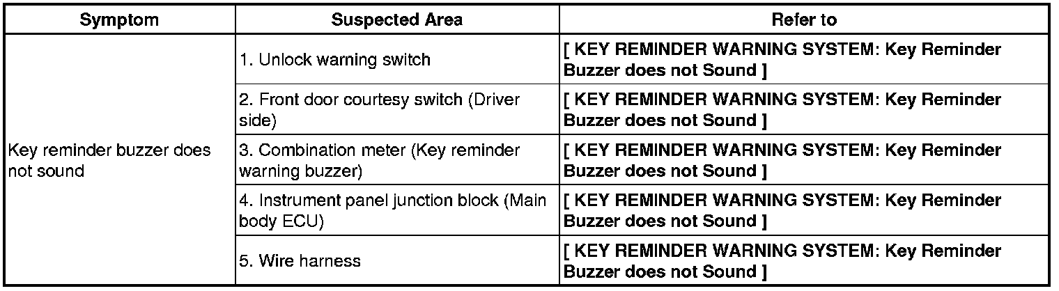 DOOR LOCK: KEY REMINDER WARNING SYSTEM: PROBLEM SYMPTOMS TABLE