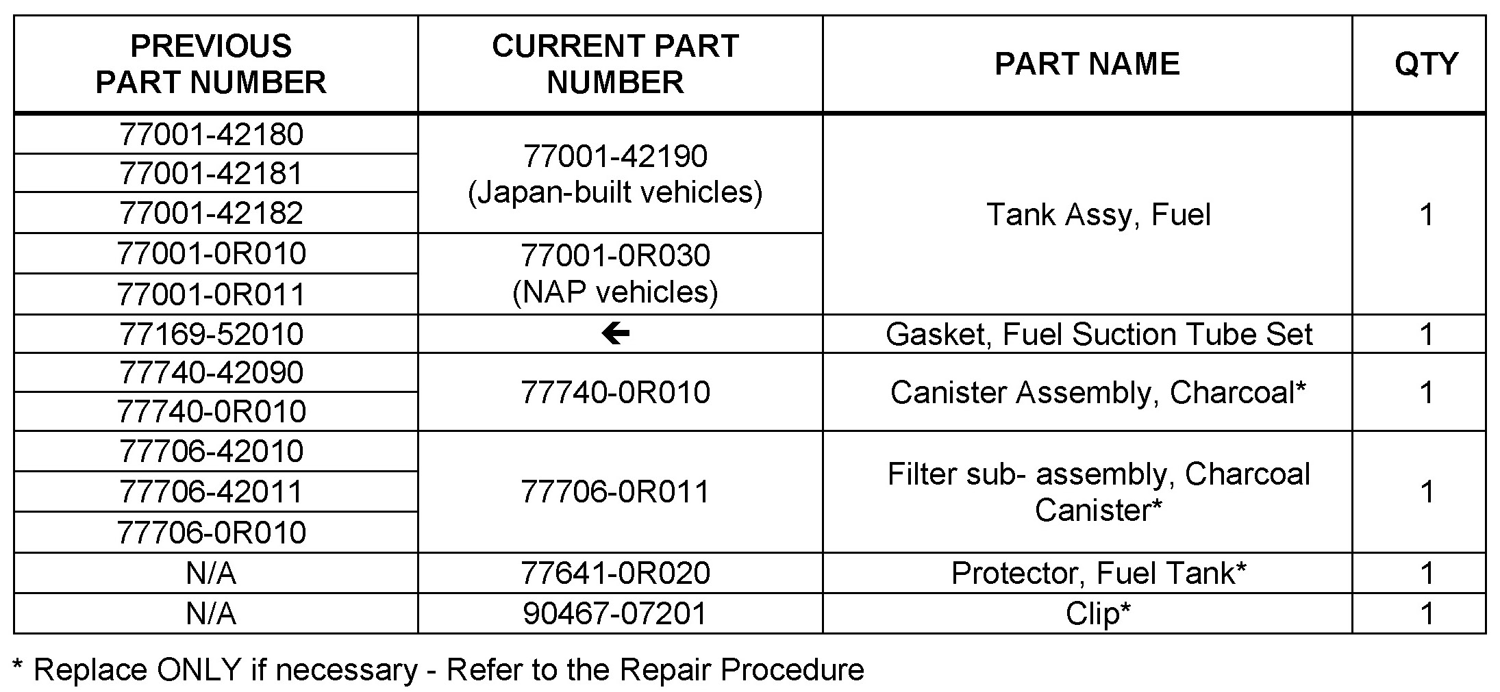 When replacing the filter sub-assembly with the current part number (77706-0R011), it may be necessary to install an additional protector (77641-0R020). For more details, refer to TSB No T-TCI-3628, "MIL "ON" DTC P043E, P043F, P2401, P2402, P2419 - Water in EVAP System".