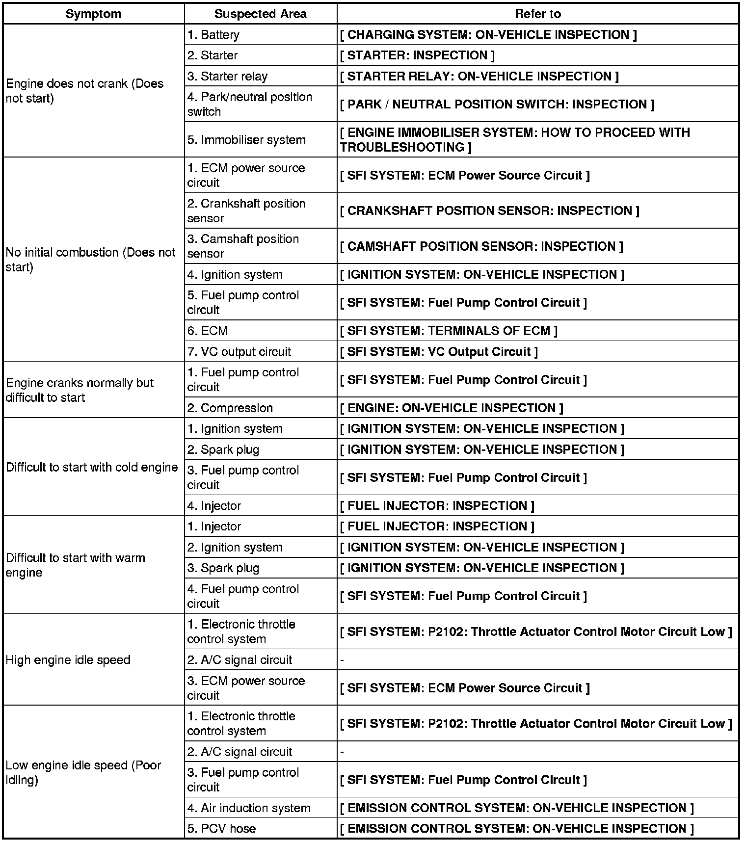 2AZ-FE ENGINE CONTROL SYSTEM: SFI SYSTEM: PROBLEM SYMPTOMS TABLE