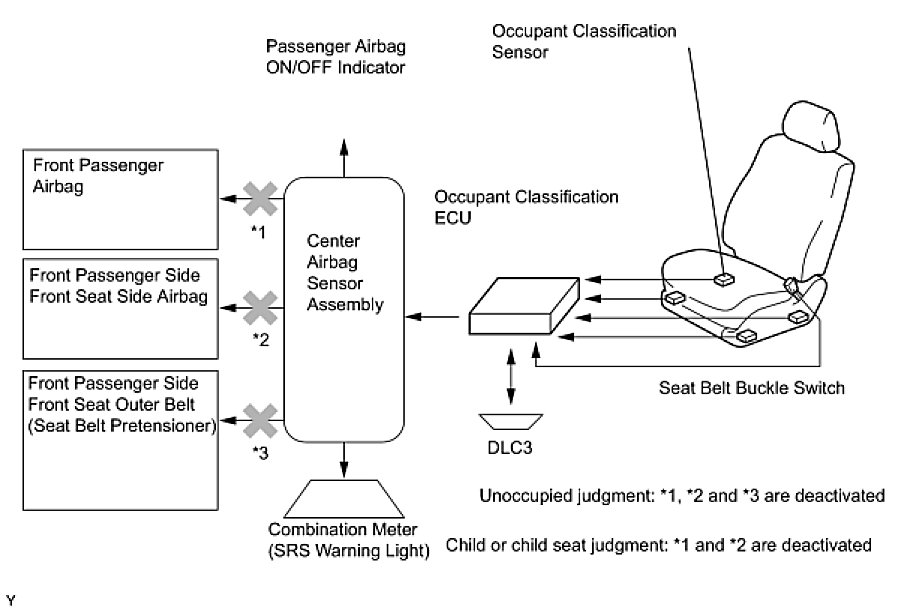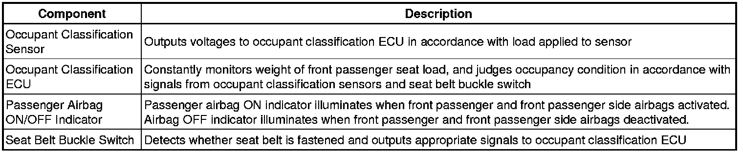(a) The front passenger occupant classification system judges whether the front passenger seat is occupied or not in accordance with the seat belt buckle status; and whether the seat is occupied by an adult or child (with child seat) in accordance with the load that is applied to the front passenger seat. Thus, when appropriate, it restricts the deployment of the front passenger airbag, front passenger side airbag, and the front passenger seat belt pretensioner. In addition, the system informs the driver of the result of the judgment through the use of the airbag ON/OFF indicator.