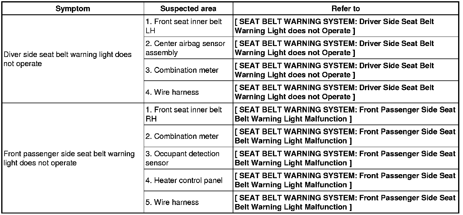 SEAT BELT: SEAT BELT WARNING SYSTEM: PROBLEM SYMPTOMS TABLE