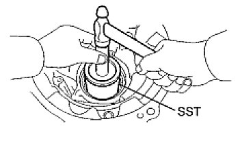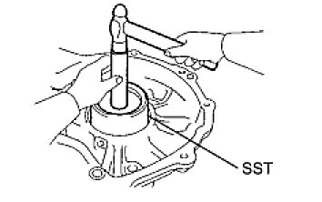 (b) Using SST, remove the front differential case tapered roller bearing rear outer race from the differential case washer.
