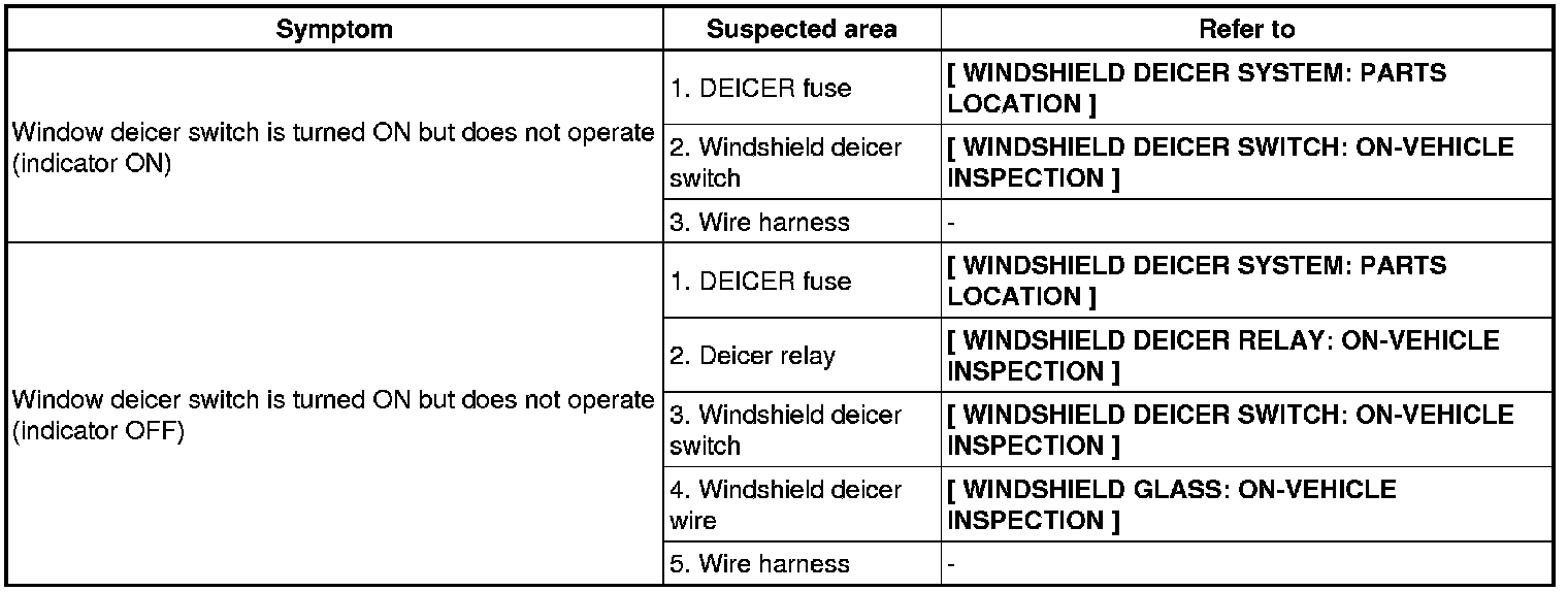 WINDSHIELD / WINDOWGLASS: WINDSHIELD DEICER SYSTEM: PROBLEM SYMPTOMS TABLE