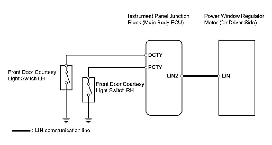 - The power window control system uses a multiplex communication system (LIN). Inspect the communication function by following HOW TO PROCEED WITH TROUBLESHOOTING. Troubleshoot the power window control system after confirming that the communication system is functioning properly.