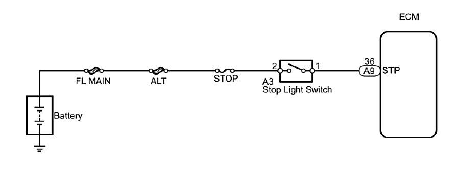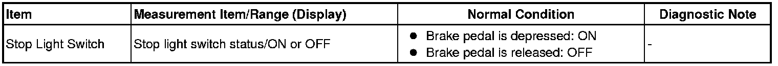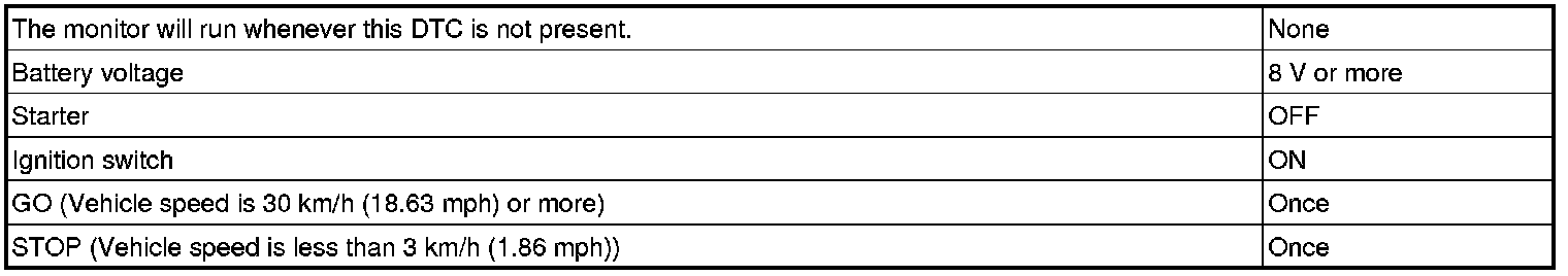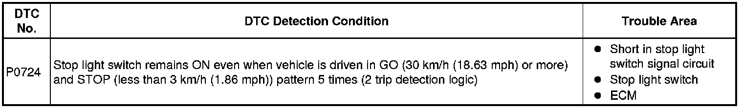 This DTC indicates that the stop light switch remains ON. When the stop light switch remains ON during GO and STOP driving, the ECM interprets this as a fault in the stop light switch. Then the MIL illuminates and the ECM stores the DTC. The vehicle must GO (30 km/h (18.63 mph) or more) and STOP (less than 3 km/h (1.86 mph)) 5 times for 2 driving cycles in order for the DTC to be output.