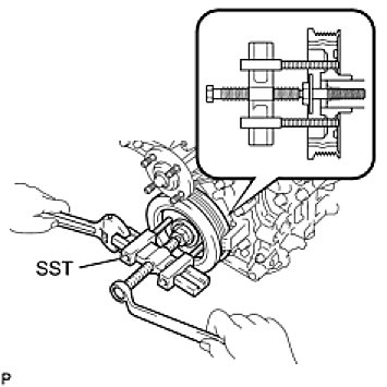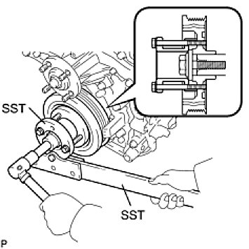(b) Using the pulley set bolt and SST, remove the crankshaft pulley.