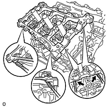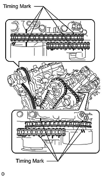 (c) Check that the timing marks of the camshaft timing gears are aligned with the timing marks of the bearing cap as shown in the illustration. If not, turn the crankshaft 1 revolution (360°) and align the timing marks as above.