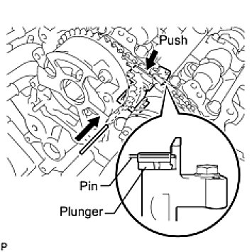 (a) While pushing down the No. 3 chain tensioner, insert a pin of dia1.0 mm (0.039 in.) into the hole to fix the No. 3 chain tensioner.