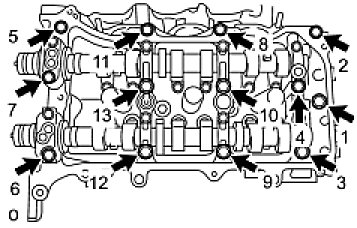 (d) Uniformly loosen and remove the 13 bearing cap bolts in the sequence shown in the illustration.