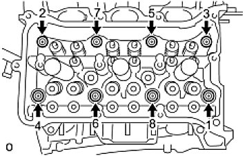 (a) Using a 10 mm bi-hexagon wrench, uniformly loosen the 8 bolts in the sequence shown in the illustration. Remove the 8 cylinder head bolts and plate washers.