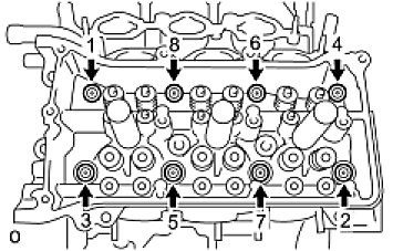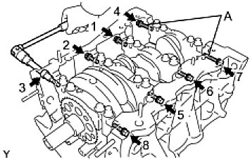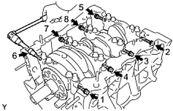 (a) Uniformly loosen and remove the 8 main bearing cap bolts and seal washers in several steps, in the sequence shown in the illustration.