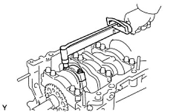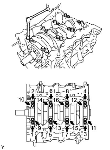 (b) Uniformly loosen the 16 bearing cap bolts in several steps, in the sequence shown in the illustration.