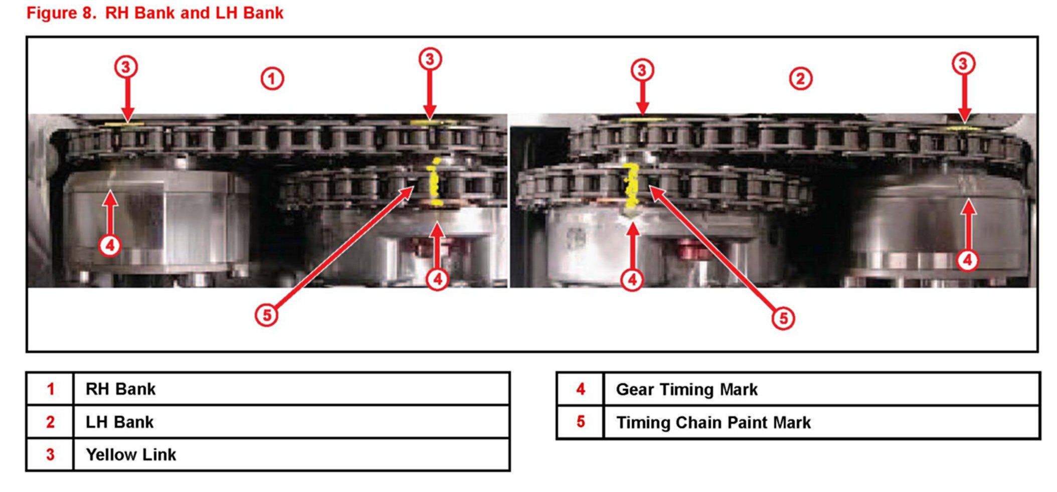2. If NEW camshaft timing gears or the No. 2 timing chain are being installed the two yellow links on the No. 2 timing chain can be used to ensure correct relationship between the intake timing gear and the exhaust timing gear.