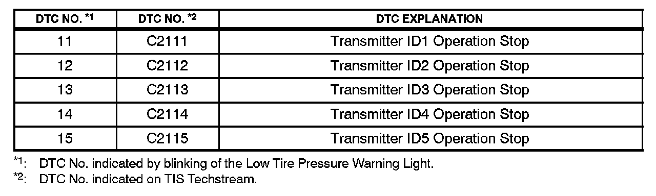^ The Diagnostic Trouble Codes (DTCs) listed below are stored in the TPWS ECU until the tire pressure warning valves/sensors are activated.
