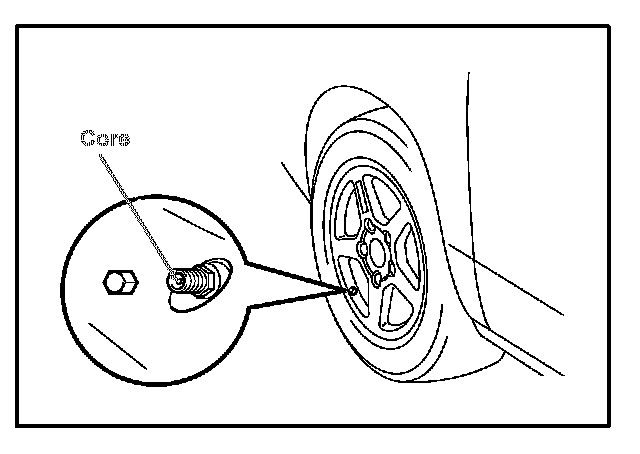 3. Press or remove the valve core to reduce the tire inflation pressure rapidly by 6 psi (0.4 kgf/sq.cm, 40 kPa), or more, within 30 seconds.
