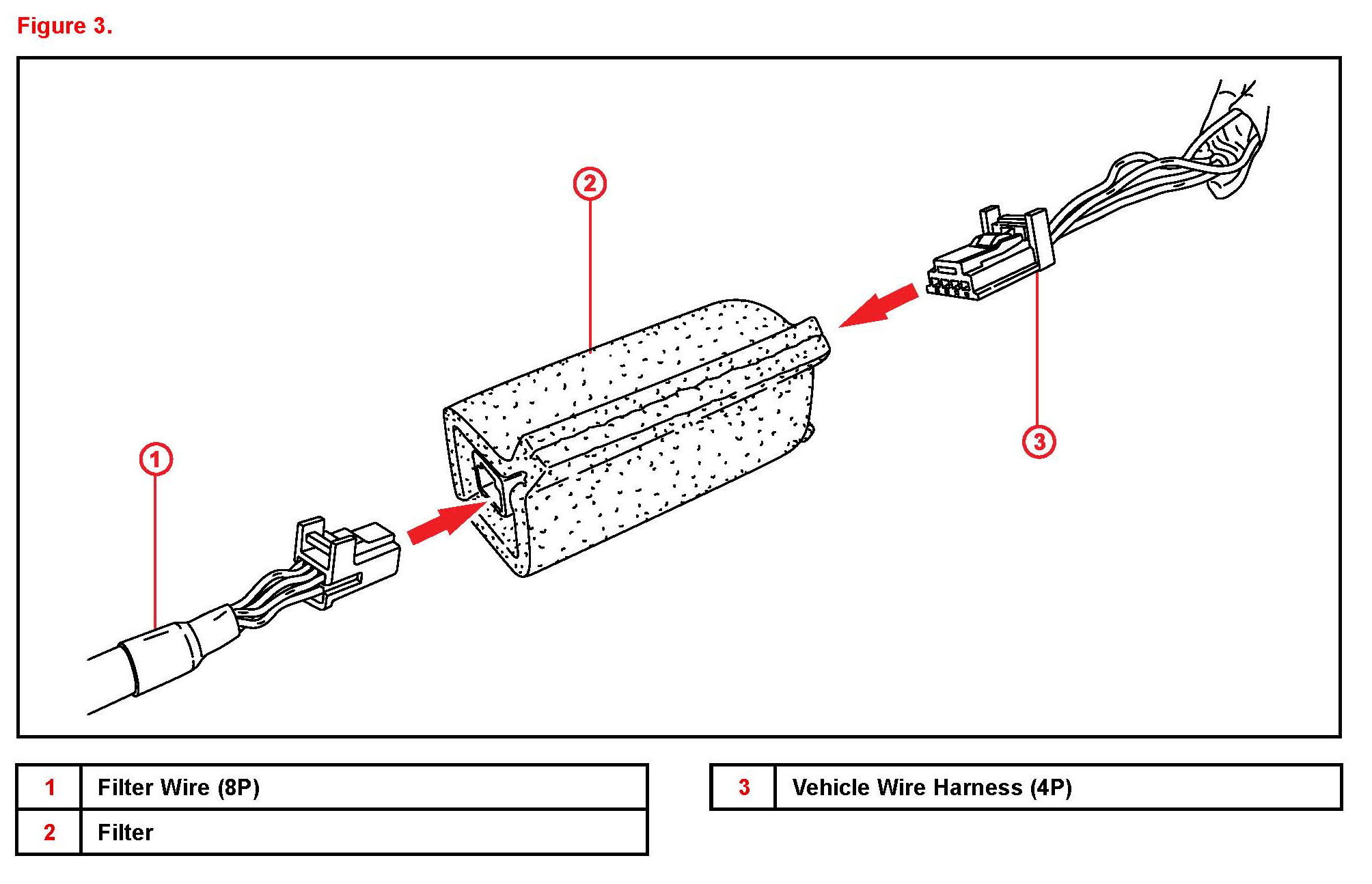 A. Connect the vehicle wire connector (4P) into the filter and connect the filter wire connector (8P) into the filter.