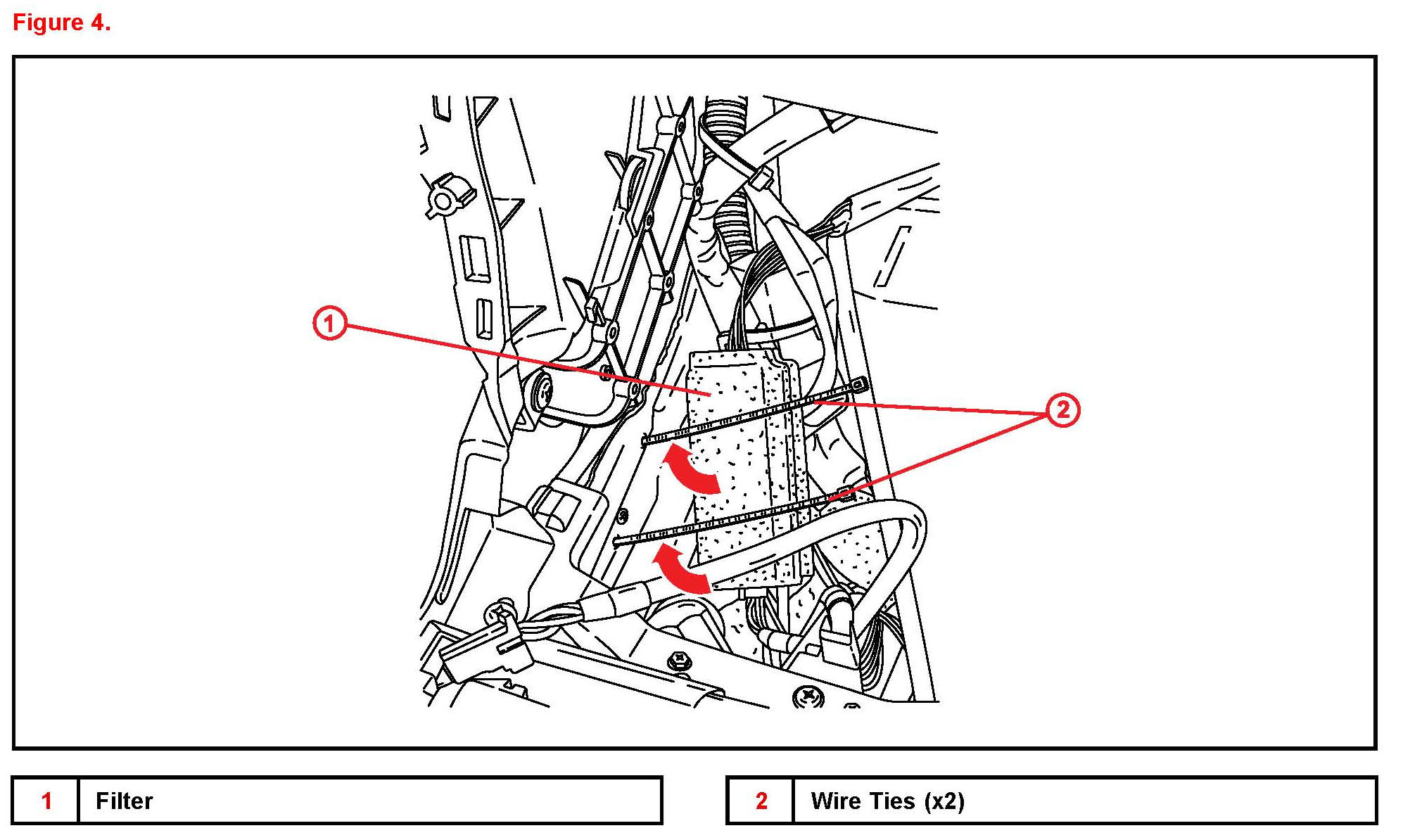 B. Secure the filter to the vehicle wire harness using wire ties.