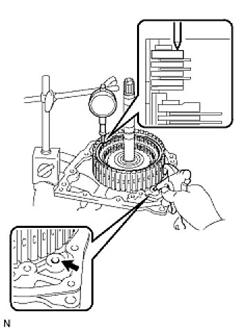 (a) Using a dial indicator, measure the direct clutch and overdrive clutch pack clearance while applying and releasing compressed air (392 kPa, 4.0 kgf/cm2, 57 psi).