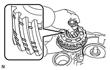 - Fully engage all the discs of underdrive clutch and hub splines of the underdrive planetary gear and install them securely.