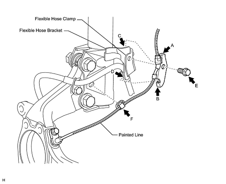(3) Tighten together the sensor clamp, flexible hose clamp and flexible hose bracket with the bolt (labeled E).