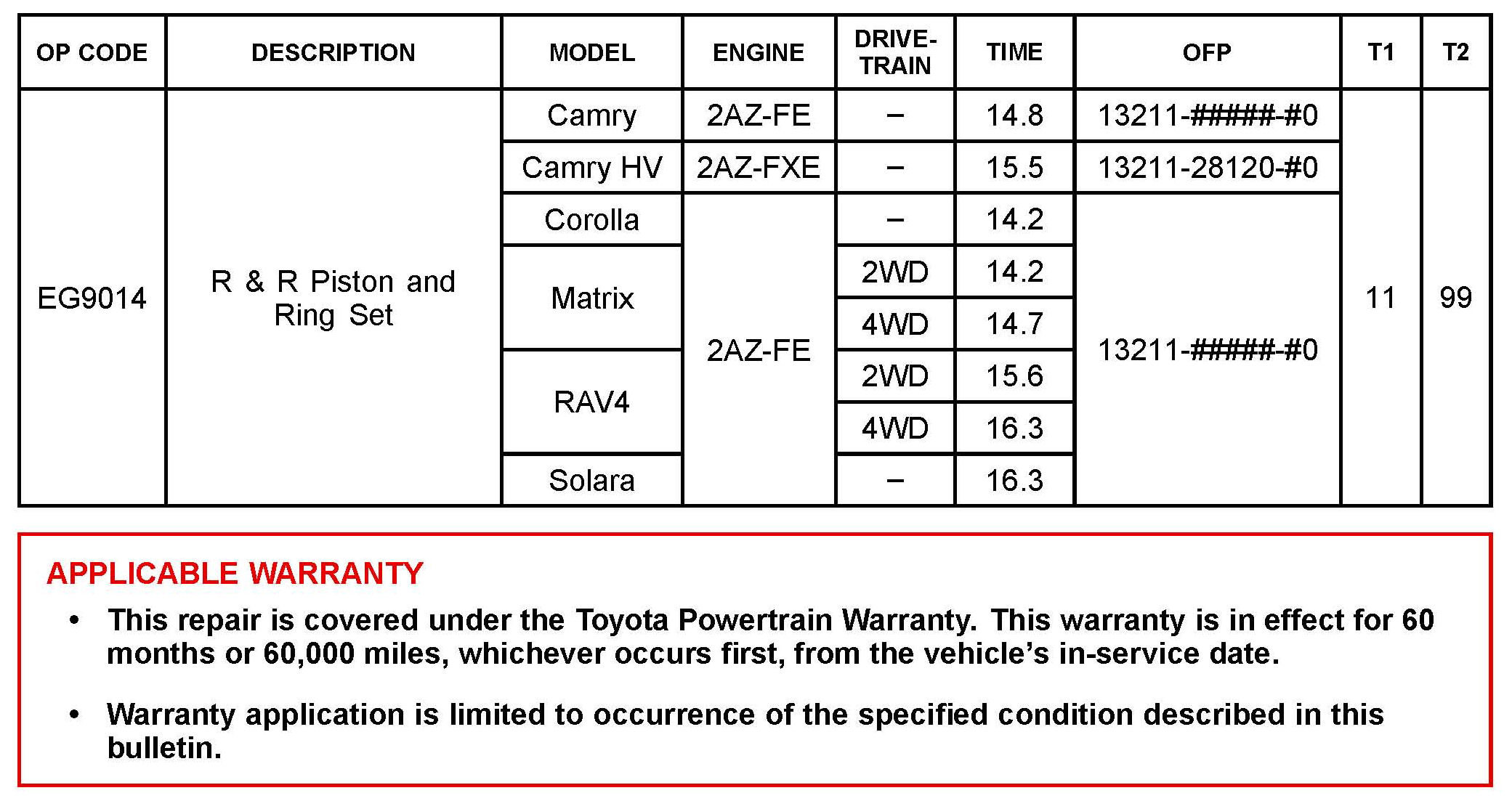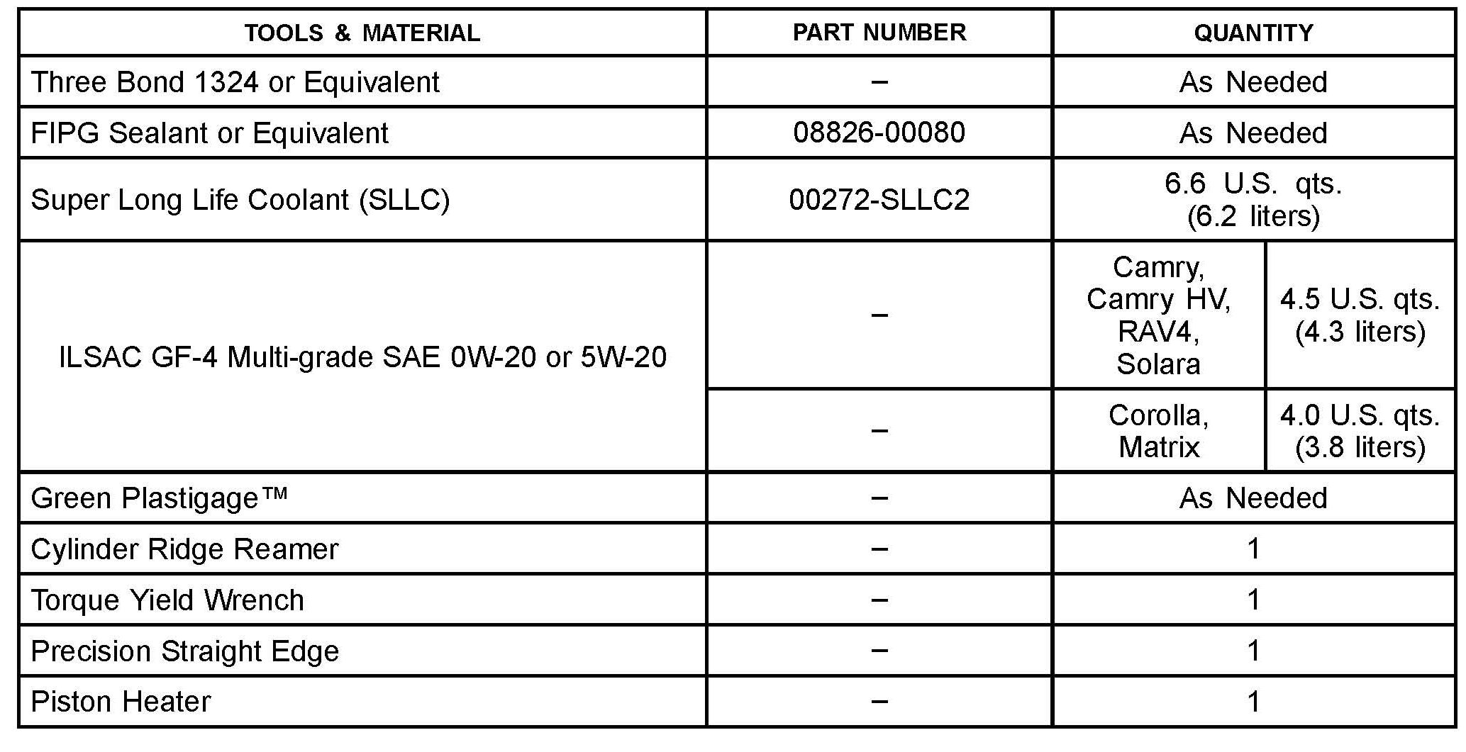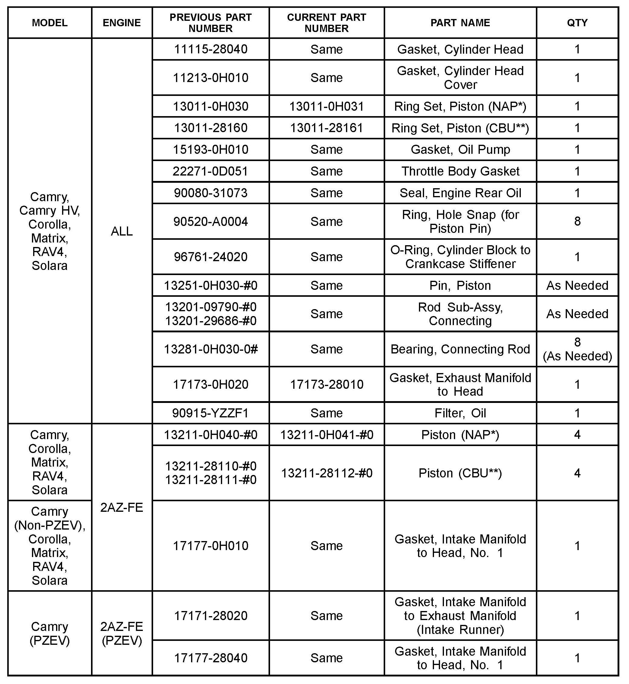 Some 2006 - 2011 model year vehicles equipped with the 2AZ-FE engine may exhibit engine oil consumption. The piston assembly has been changed to minimize oil consumption. Use the following repair procedure to address this condition.
