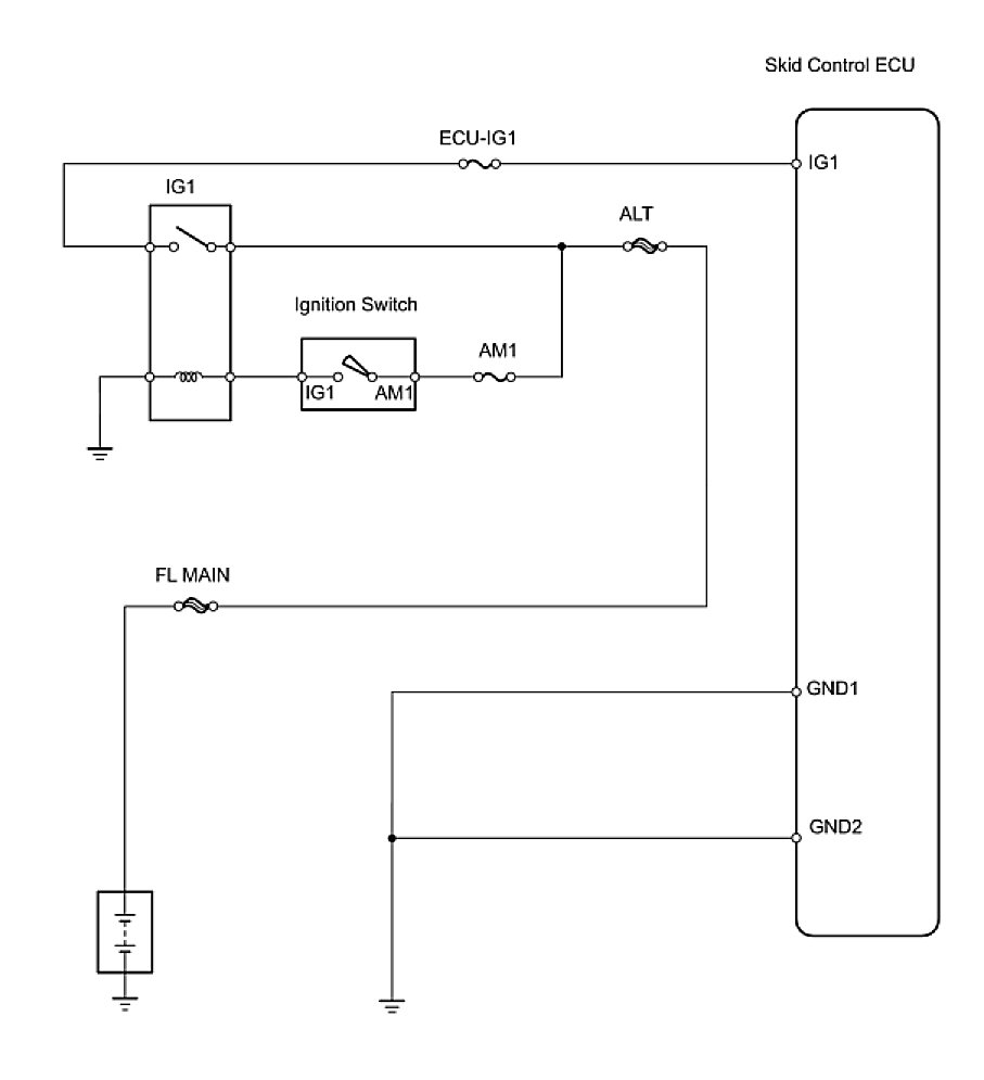 When there is an abnormality in the power supply circuit of the brake actuator (skid control ECU), the skid control ECU sets a DTC and the operation is prohibited by the fail-safe function. This DTC is set when the voltage supplied to terminal IG1 is outside the DTC detection threshold, due to abnormalities of the battery, power source circuits or charging circuits such as the alternator circuit.