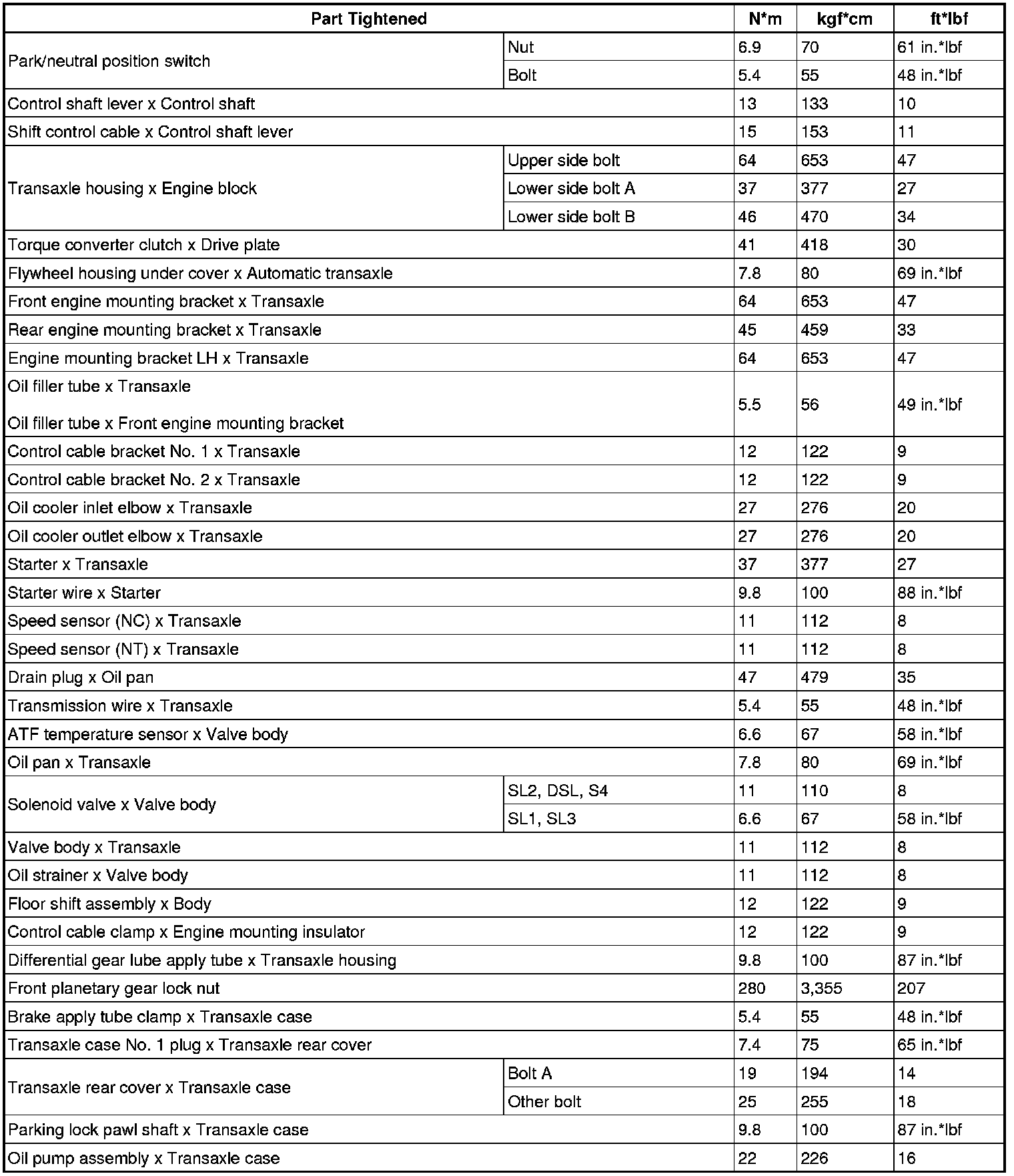 SERVICE SPECIFICATIONS: U151F AUTOMATIC TRANSAXLE: TORQUE SPECIFICATIONS