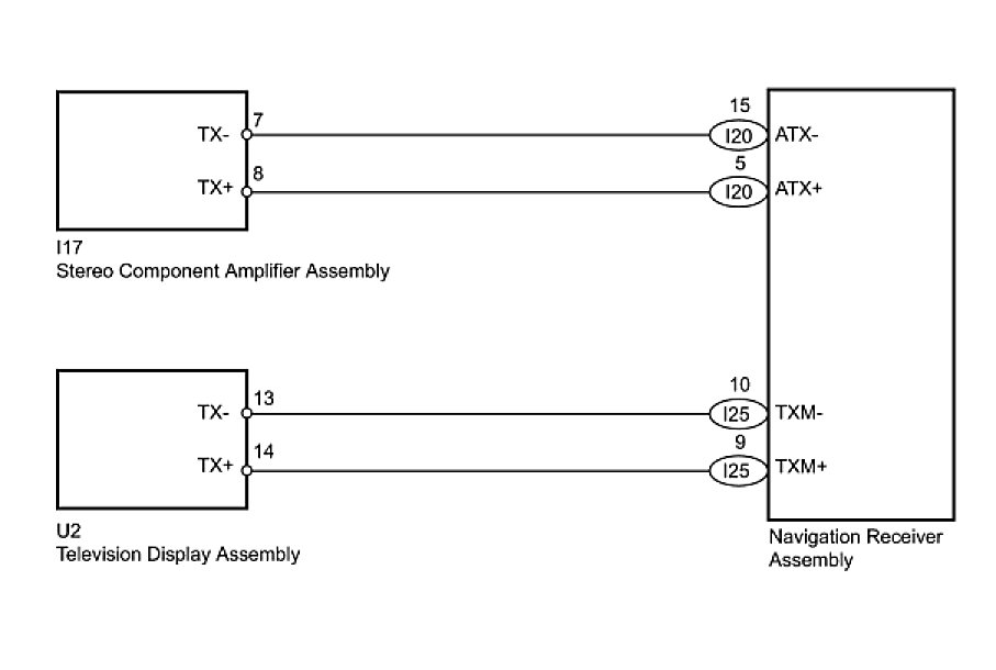 (a) Referring to the AVC-LAN wiring diagram below, check the AVC-LAN circuit between the navigation receiver assembly and the component shown by the sub-code.
