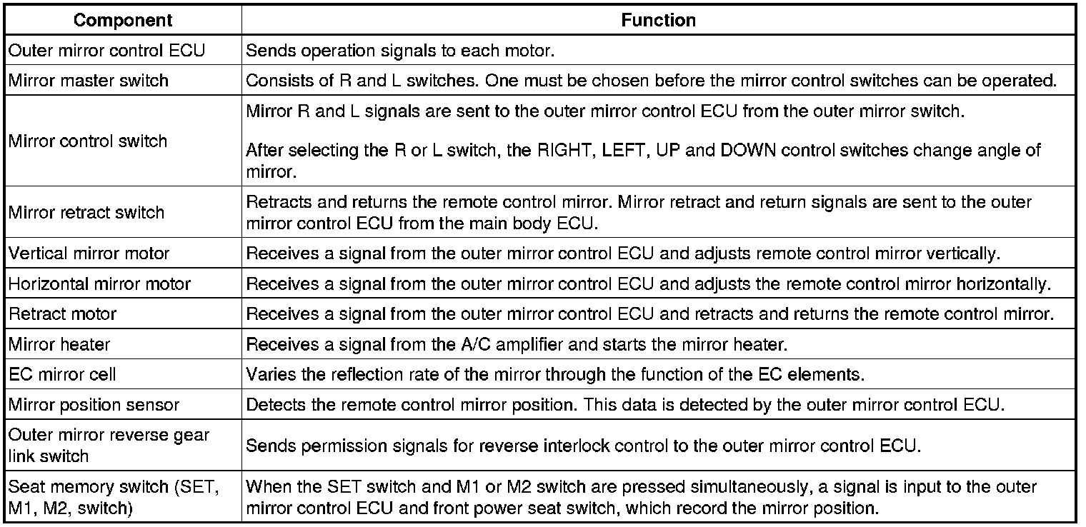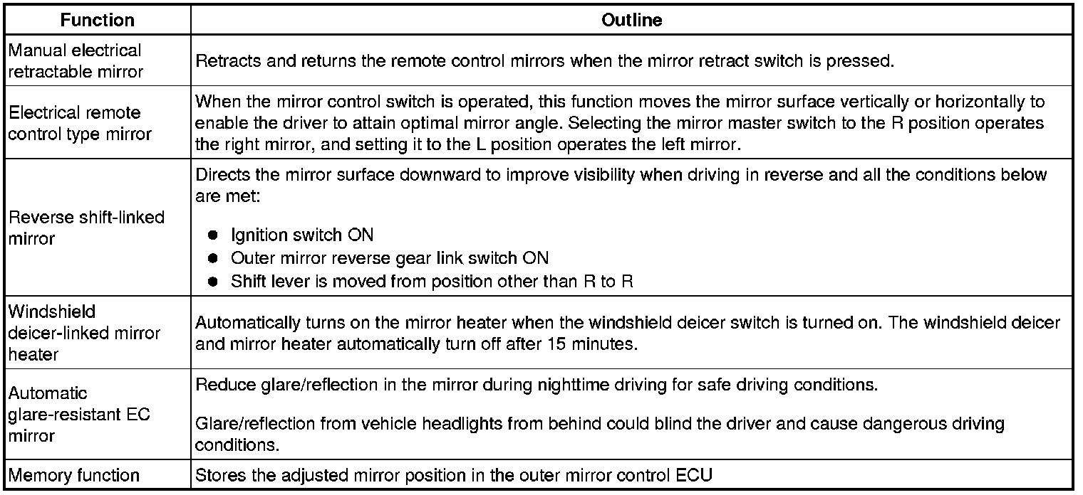 (a) This system has the following functions: automatic glare-resistant electrochromic (EC) mirror, reverse shift-linked mirror, electrical remote control type mirror, memory function, and windshield deicer-linked mirror heater.