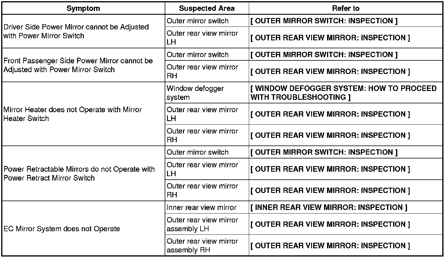 MIRROR (EXT): POWER MIRROR CONTROL SYSTEM (w/o Memory): PROBLEM SYMPTOMS TABLE