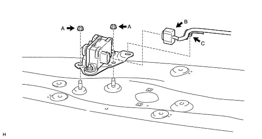 (b) Disconnect the sensor connector (labeled B), and then detach the clamp (labeled C) from the sensor bracket.