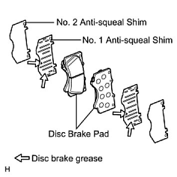 (b) Install the No. 1 and No. 2 anti-squeal shims to each pad.