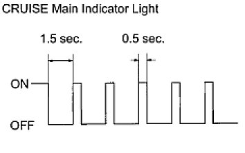 HINT: While driving with cruise control, the ECM activates AUTO CANCEL of the cruise control system when a malfunction occurs in one of the following: vehicle speed sensors, stop light switch, or other related parts. When AUTO CANCEL is activated, the CRUISE main indicator light outputs the blinking pattern as shown in the illustration. At the same time, data of the malfunction is stored as a DTC.