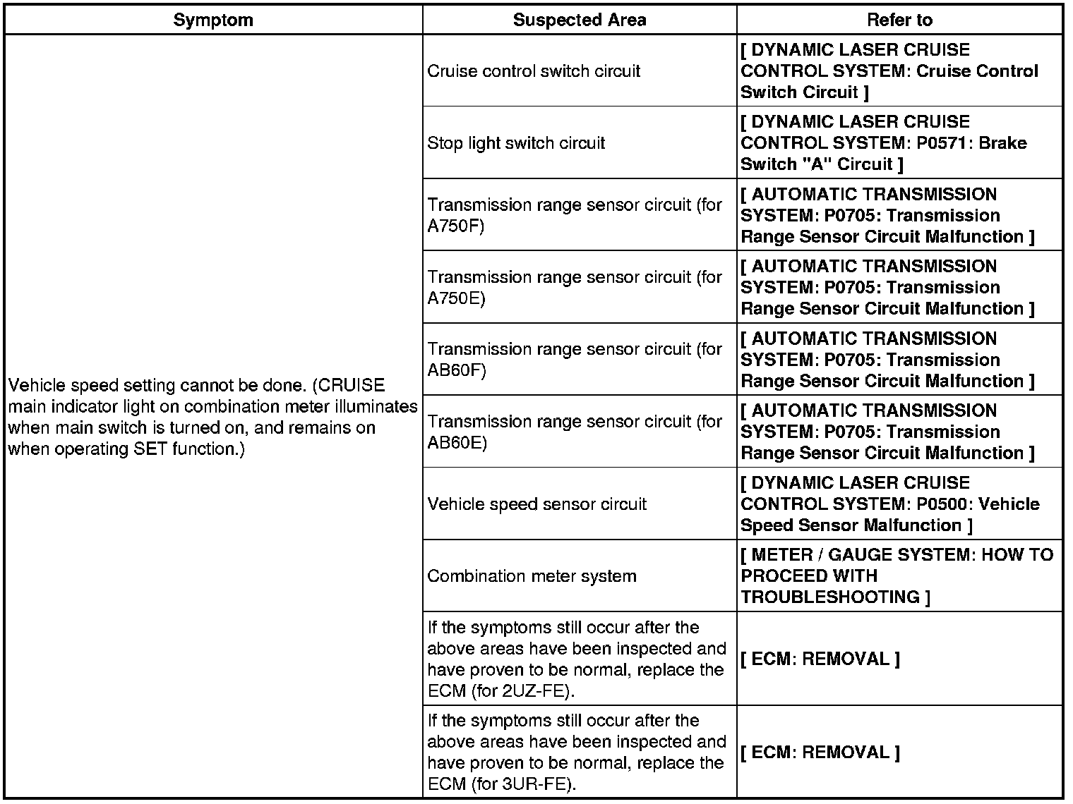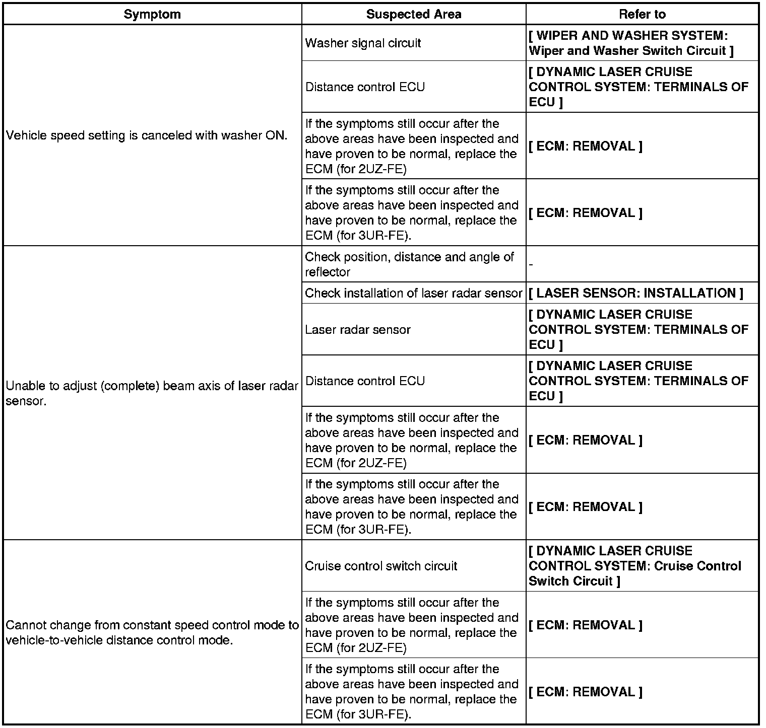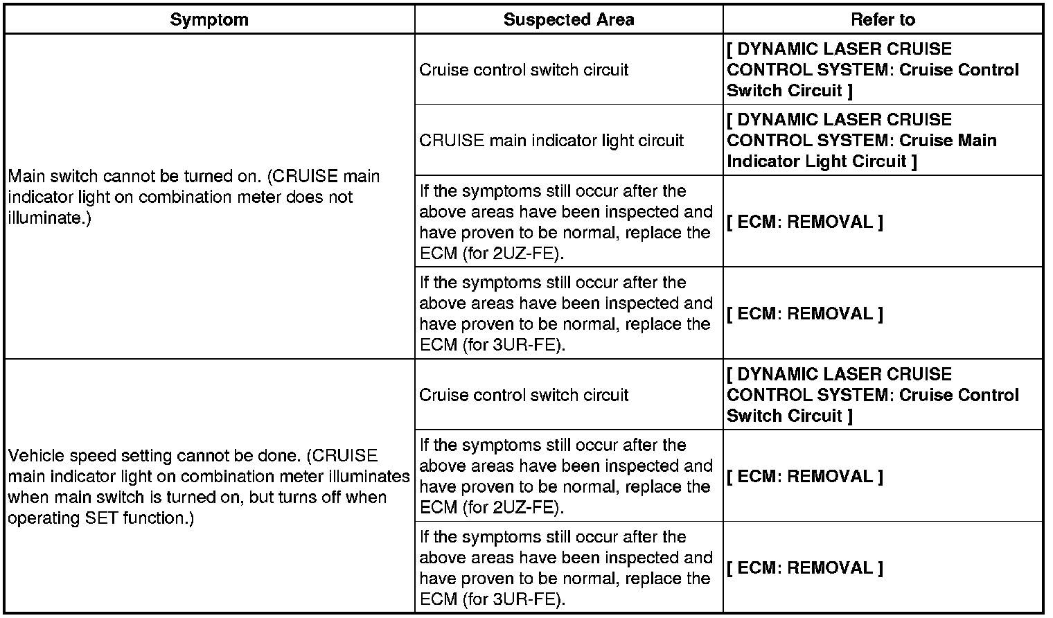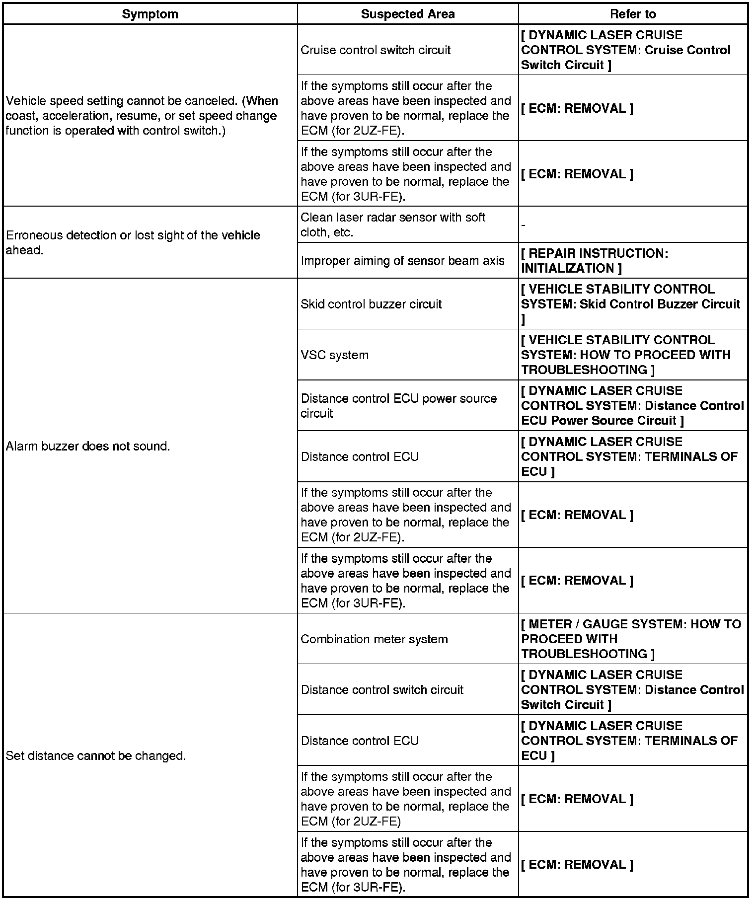 CRUISE CONTROL: DYNAMIC LASER CRUISE CONTROL SYSTEM: PROBLEM SYMPTOMS TABLE