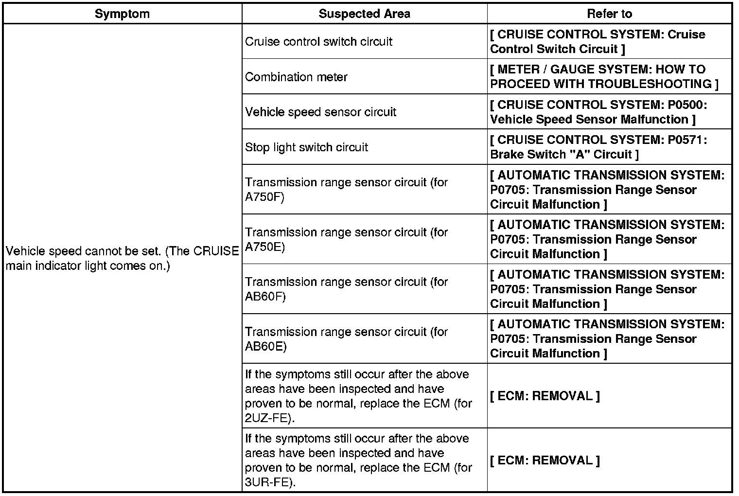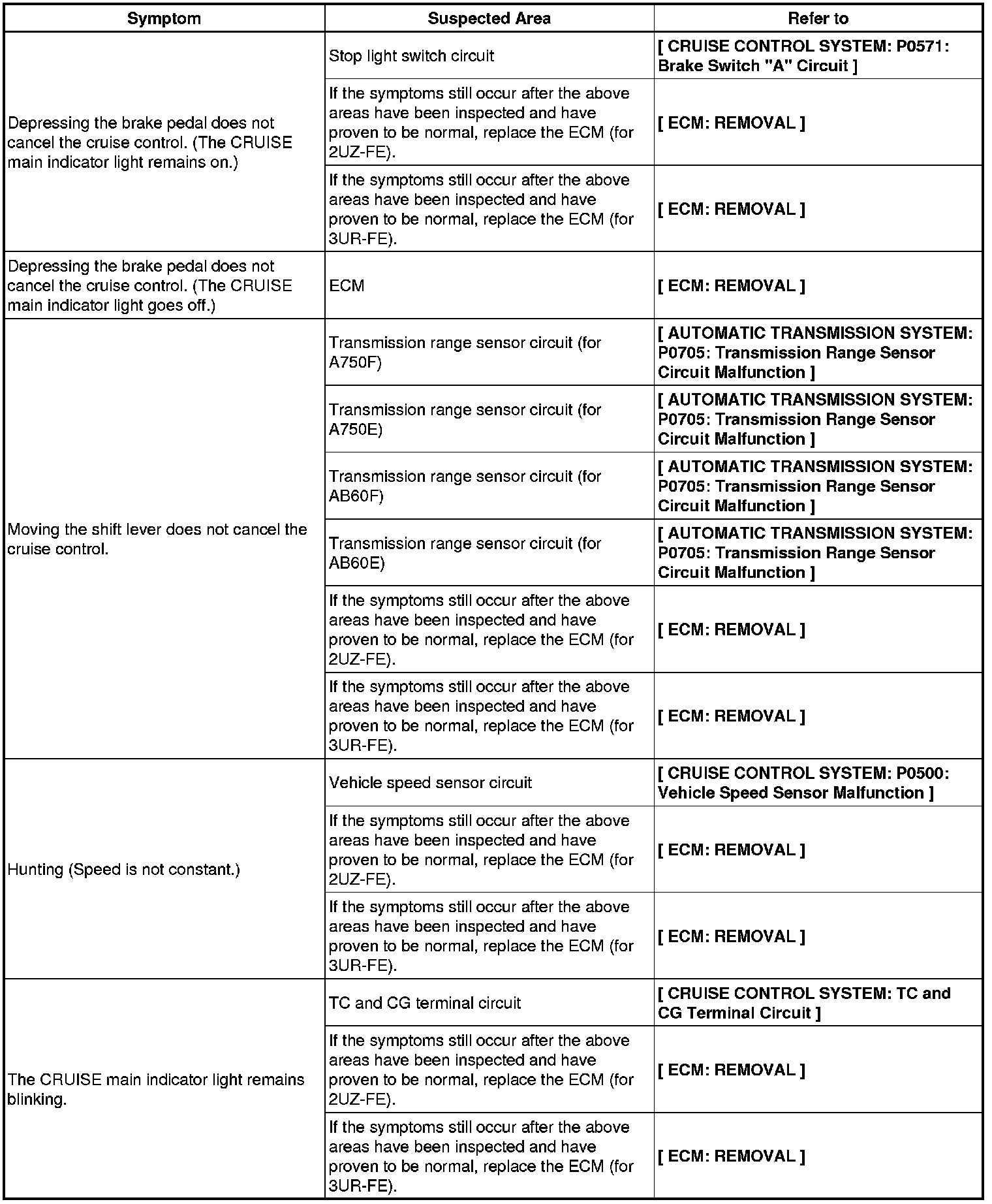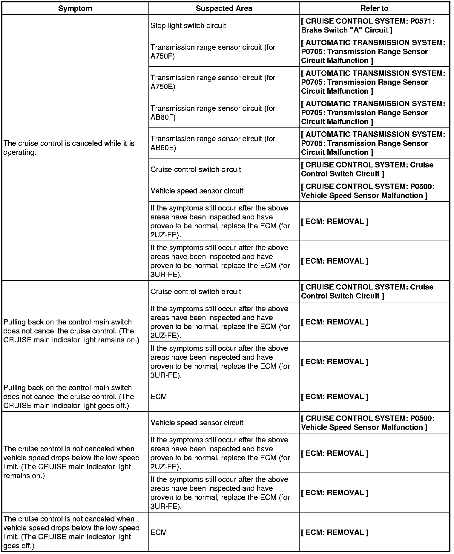 CRUISE CONTROL: CRUISE CONTROL SYSTEM: PROBLEM SYMPTOMS TABLE