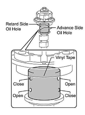 (3) Open a hole in the tape at 2 places, one in the retard side oil hole and one in the advance side oil hole as shown in the illustration.