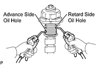 (4) Apply approximately 200 kPa (2.0 kgf/cm2, 29 psi) of air pressure to the 2 open oil holes (the advance side oil hole and the retard side oil hole).