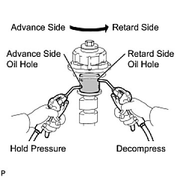 - Do not release the air pressure from the advance side oil hole first. The tube may abruptly shift in the retard direction and break the lock pin.