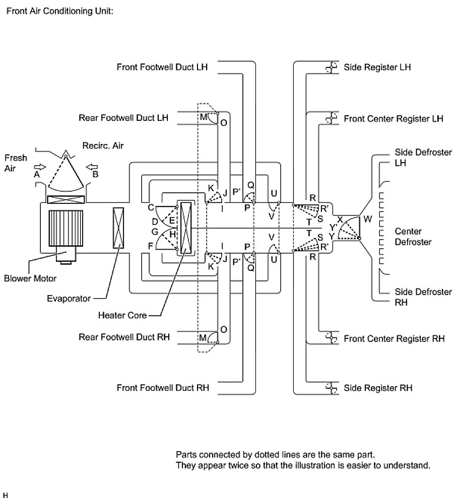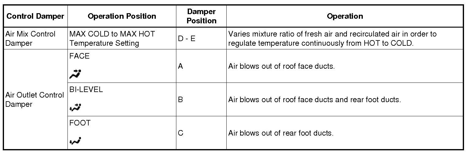 (a) Mode Position and Damper Operation (for Front Air Conditioning Unit)