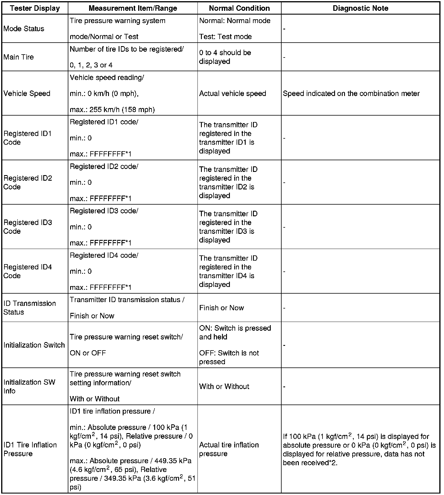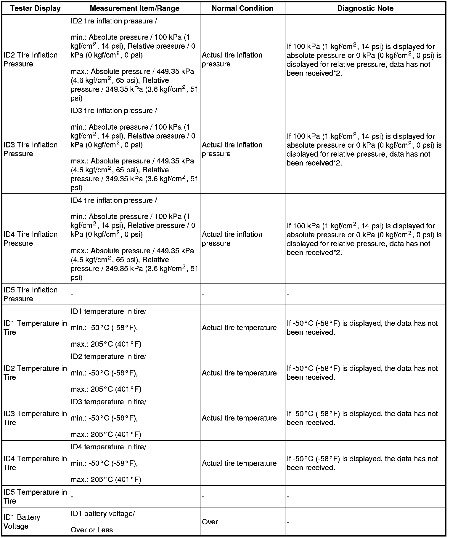*2: It may take up to about 5 to 6 minutes to update the tire pressure data. If the values are not displayed after about 5 to 6 minutes, perform troubleshooting according to the inspection procedure for DTCs C2121/21 to C2124/24 C2121.