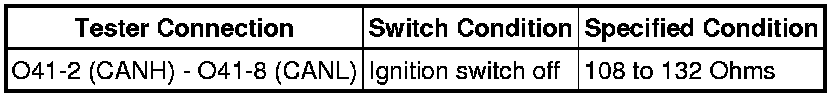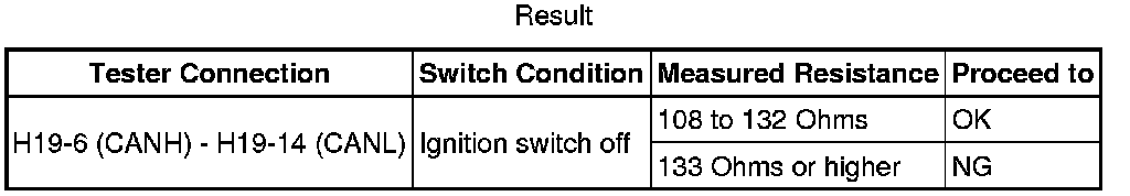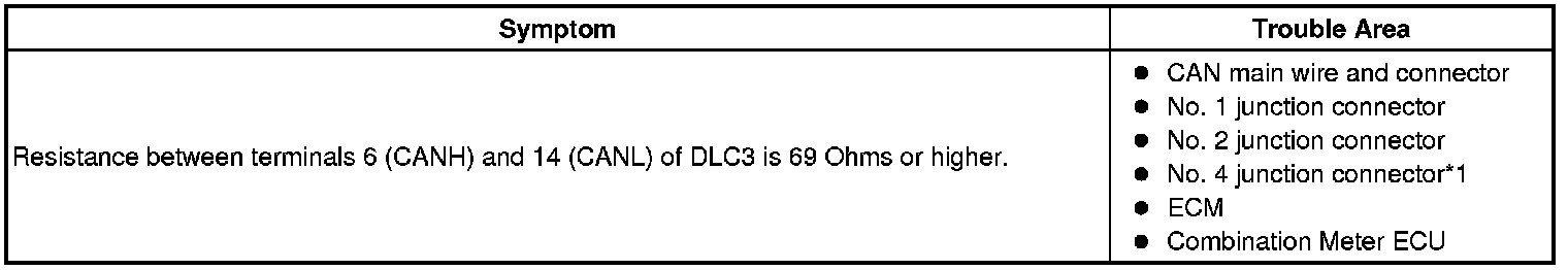 There may be an open circuit in the CAN main wire and/or the DLC3 branch wire when the resistance between terminals 6 (CANH) and 14 (CANL) of the DLC3 is 69 Ohms or higher.