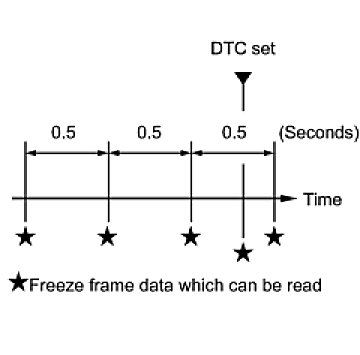 (b) The Techstream records freeze frame data in 5 different instances: 1) 3 times before the DTC is set, 2) once when the DTC is set, and 3) once after the DTC is set. These data can be used to simulate the vehicle's condition around the time when the malfunction occurred. The data may help find the cause of the malfunction, or judge if the DTC is being caused by a temporary malfunction or not.