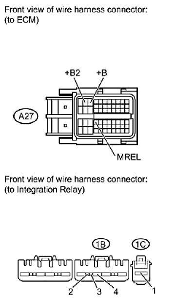 When the ignition switch is turned ON, the battery voltage is applied to the IGSW of the ECM. The output signal from the MREL terminal of the ECM causes a current to flow to the coil, closing the contacts of the integration relay (EFI MAIN relay) and supplying power to either terminal +B or +B2 of the ECM.